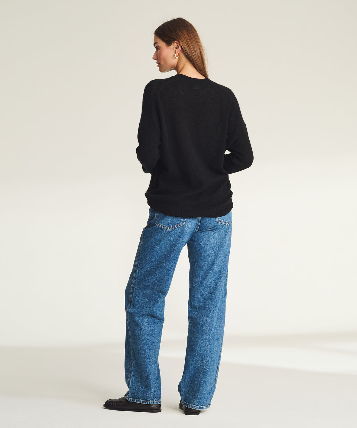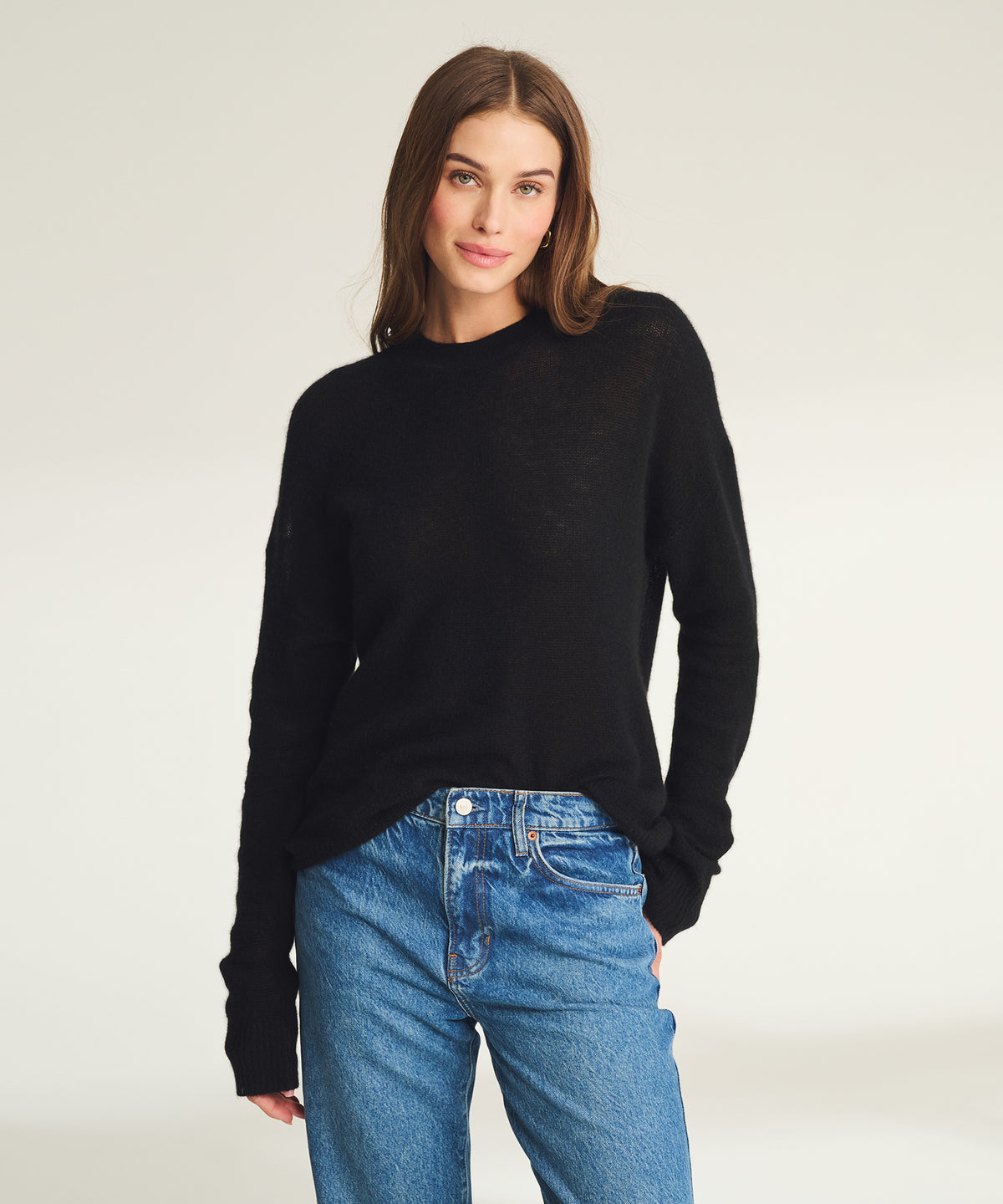 The Featherweight Cashmere Crewneck Sweater is a delicate, lightweight sweater with a relaxed classic fit and long classic length designed to sit at the center of the hips. It features a crew neckline, drop shoulders, and ribbed details. Crafted from a sheer, finely knit cashmere.
